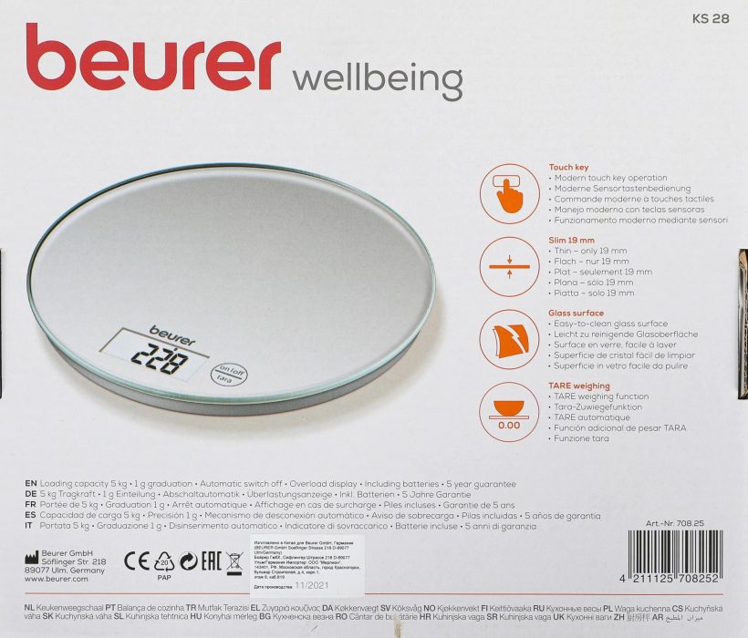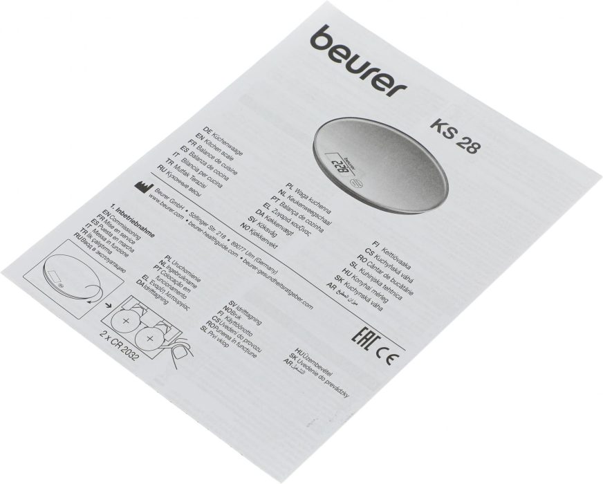 | Наименование полное (1С) | Весы кухонные Beurer KS28 (электронные, максимальный вес: 5 кг, цена деления: 1 г, материал платформы: стекло, питание: 2хCR2032, цвет серебристый) |