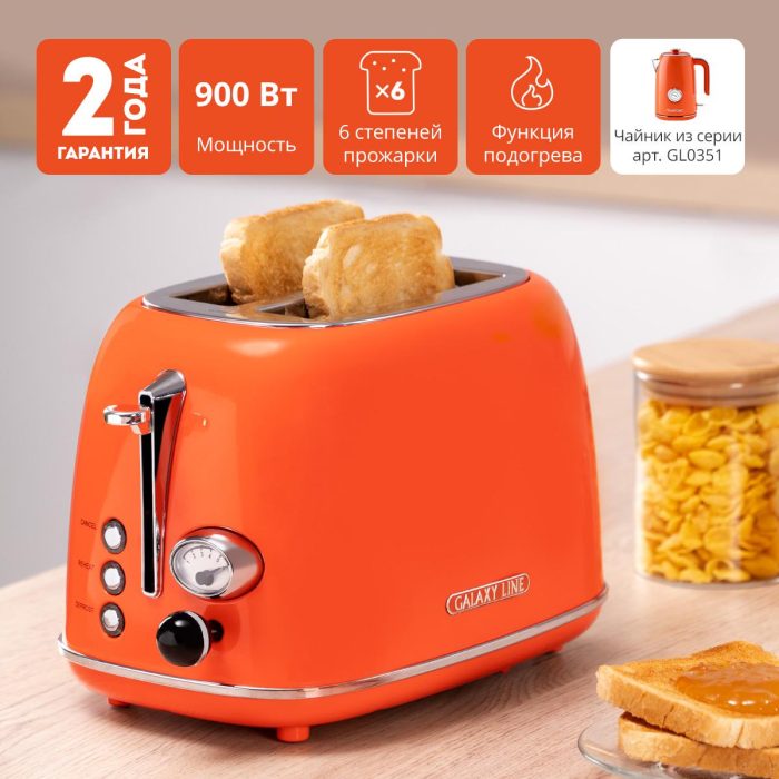 | Наименование полное (1С) | Тостер Galaxy Line GL 2921 (7021329210) (металл, 900 Вт, функция подогрева и разморозки, 6 степеней поджарки, цвет: оранжевый / апельсиновый фреш) |